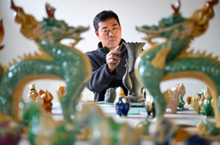 2025年3月11日,河南省洛阳市瀍河区白马寺镇金村的工艺品作坊内,民间艺人正专心致志地制作着唐三彩文创产品。近年来,当地政府积极推行“唐三彩+文旅+文创”的融合发展模式,有效带动了村民就业,所创作的唐三彩文创产品深受市场欢迎,畅销全国各地。李卫超摄(人民图片网)